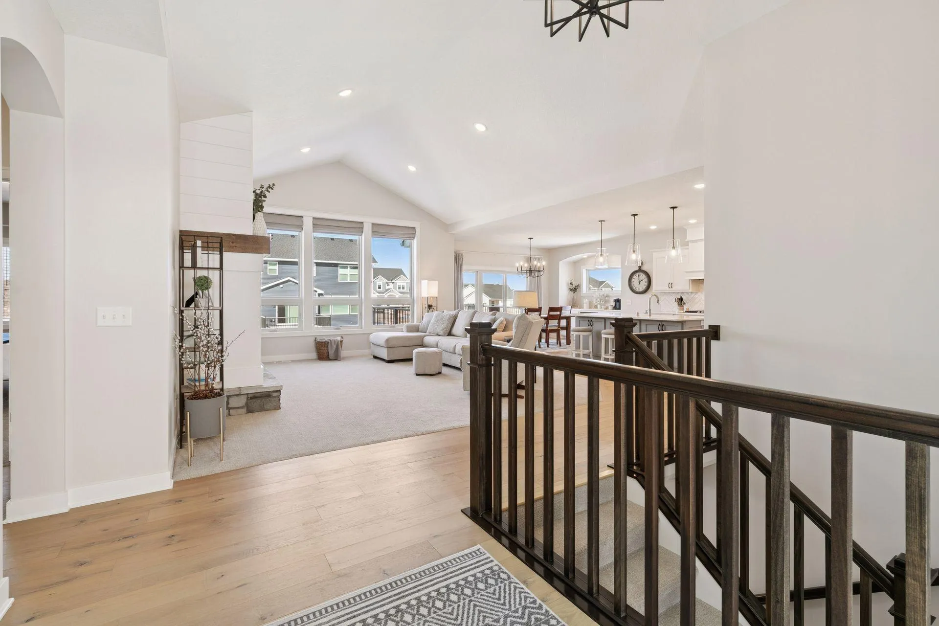 Experience refined main-level living in this beautifully designed home set on a private lot at the end of a low-traffic street, bordered by peaceful country views. From the moment you come inside, you’ll appreciate the thoughtful layout, bright open spaces, and modern finishes designed for both entertaining and everyday comfort. Large windows on both levels flood the home with natural light, highlighting the hand-scraped birch hardwood floors on the main level and gleaming granite countertops throughout. In the heart of the home, the vaulted great room is a stunning focal point, featuring a stone and shiplap surround gas fireplace that creates warmth and character next to the gourmet kitchen, where a generous center island, walk-in pantry, double wall ovens, and gas cooktop can be checked off your list. Just beyond, the spacious informal dining area includes a built-in buffet and easy access to the maintenance-free deck with a drink rail and staircase—perfect for grilling, relaxing, or hosting while enjoying serene backyard views. Also be pleased to find three bedrooms and two full baths on the main level, including the large primary suite with a walk-in closet and private bath retreat, not to mention a well-appointed laundry room and mudroom just off the insulated four-car attached garage. For the entertainer, the walkout lower level is a dream come true with its stunning family room featuring a second stone surround gas fireplace, wet bar/kitchenette with open dining space, and a game area, where you can go outside to the impressive stamped concrete patio. With two additional bedrooms and a full bath, this level provides options for guests, an office, exercise or hobby room. Located close to Cub Foods, Heritage Library, and vibrant downtown Lakeville with its restaurants and coffee shops, this home also offers convenient access to schools and I-35 in under ten minutes. Set in a welcoming, active neighborhood, this exceptional property blends comfort, style, and location into one remarkable opportunity.