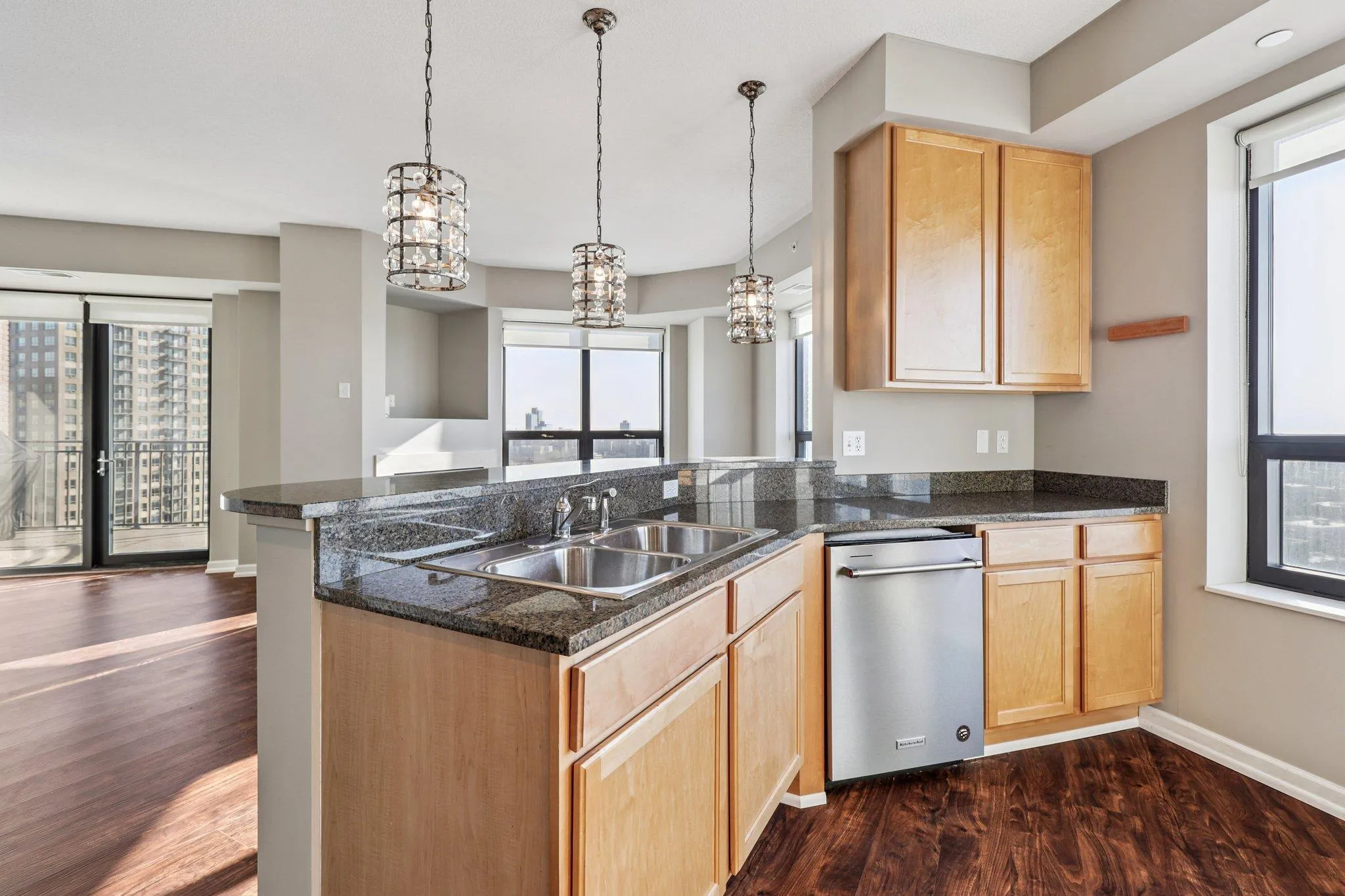 with natural light from expansive windows showcasing stunning city views. The spacious open kitchen